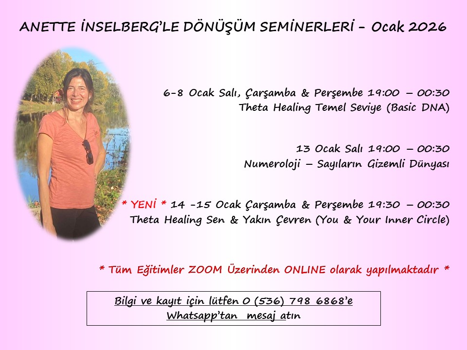 Ayrıca 6-8 Ocak tarihlerinde Türkiye saatiyle 19:15-00:30 arası (ZOOM üstünden online olarak) yapılacak olan üç günlük uluslararası uygulayıcılık sertifikalı bu eğitime katılarak artık işinize yaramayan bilinçaltı programlarınızı bulup kazı yöntemiyle değiştirip his yüklemeleriyle dileklerinizi alanınıza çekebilir; korku kızgınlık duygularınızı dönüştürebilir; uyumlu ruh eşinizi hayatınıza çekip eski ilişkilerinizle ruh parçası iadesi yapıp varoluşun yedi seviyesini öğrenip manifestler yapabilir; ihtiyarlama programınızı iptal edip sözcüklerim gücü ve çakraların gücü üzerine çalışabilirsiniz.