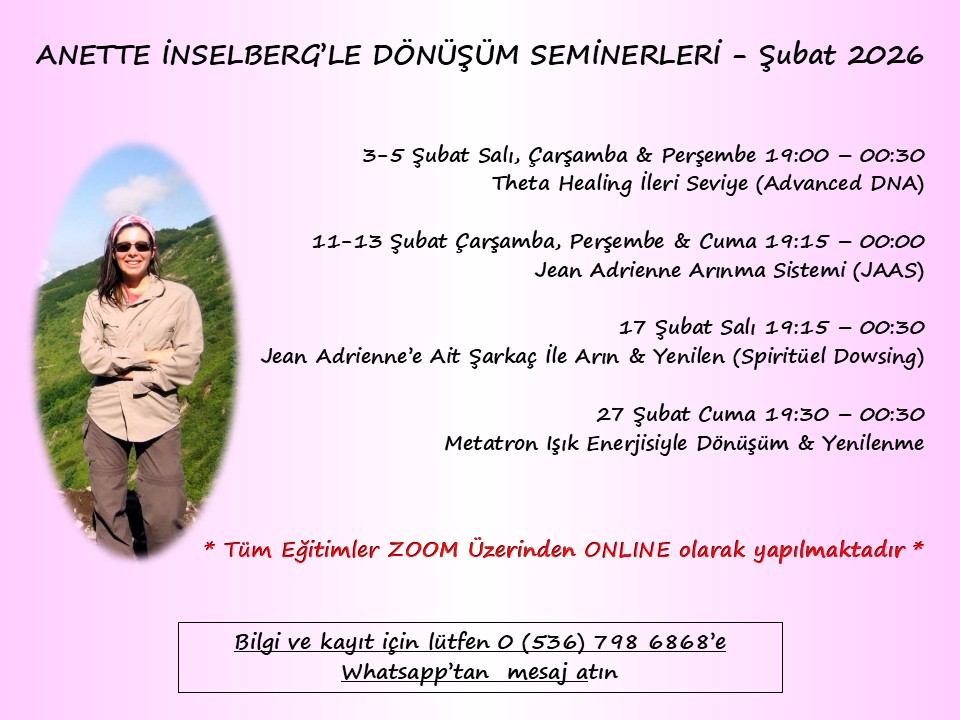 Ayrıca 6-8 Ocak tarihlerinde Türkiye saatiyle 19:15-00:30 arası (ZOOM üstünden online olarak) yapılacak olan üç günlük uluslararası uygulayıcılık sertifikalı bu eğitime katılarak artık işinize yaramayan bilinçaltı programlarınızı bulup kazı yöntemiyle değiştirip his yüklemeleriyle dileklerinizi alanınıza çekebilir; korku kızgınlık duygularınızı dönüştürebilir; uyumlu ruh eşinizi hayatınıza çekip eski ilişkilerinizle ruh parçası iadesi yapıp varoluşun yedi seviyesini öğrenip manifestler yapabilir; ihtiyarlama programınızı iptal edip sözcüklerim gücü ve çakraların gücü üzerine çalışabilirsiniz.