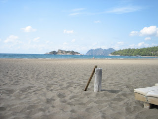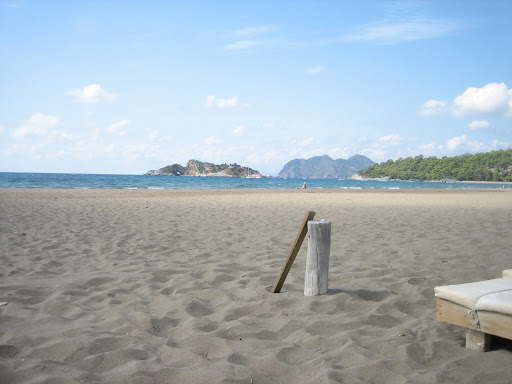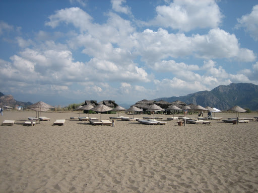 Arkasından iztuzuna plajına varıyorsunuz. Burada kumlar altın sarısı ve yumuşacık. Deniz çok temiz. Kaplumbağalar her sene buraya gelip yumurtluyorlar ve yaşam savaşlarına burada başlıyorlar. Kaplumbağaların bölgesi koruma altında ve diğer taraflardan iplerle ayrılmış durumda. İztuzu plajından iki görüntü…