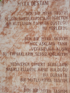 Bir de Demre’den ayrılırken Myra destanını görüyorum. Okuyorum onu… Ve çok etkileniyorum… Ben bu toprakların sessiz çığlığıyım diyor. Yediveren cömert seraların nasırlı ellerde hayat bulduğu bu durakta bir mutlu Myra taşıyım diyor…Ben bir Myra taşıyım diyor… Mutlaka gidip, tamamını okuyun derim…