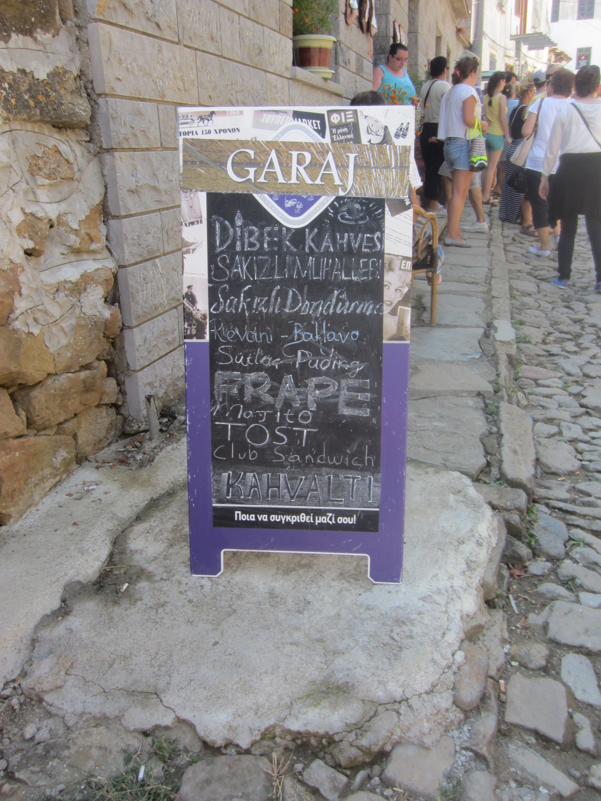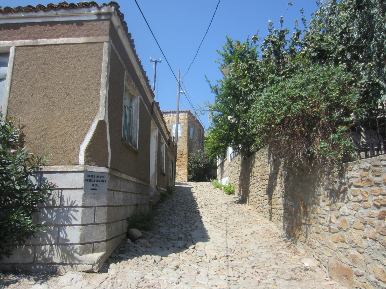 Sırada yine koruma altında olan eski Rum köyü Zeytinli vardı. Dar sokaklar burada daha hareketliydi. İlk gördüğüm cafeye girip, sakızlı muhallebi üstüne karadutlu dondurma istedim. Her ikisinin de tadına bayıldım. Bazıları dibek kahvesi istedi ama ben kahveci olmadığımdan istemedim. Ama içenler tadını beğendi. Çayımı içerken önümdeki yeşilliği doya doya seyretmek istedim ama yoldaki ilk cafeye girdiğimden acaba en iyisi bu muydu telaşı aldı beni ve yokuştan yukarı çıkarak diğerlerini de gezmeye başladım. Hepsi doluydu ve hepsinin de menüsü aynıydı ama en güzel manzara ilk girdiğim yerin olduğunu görünce koşa koşa geri döndüm ve manzara karşısında bir çay daha içtim.