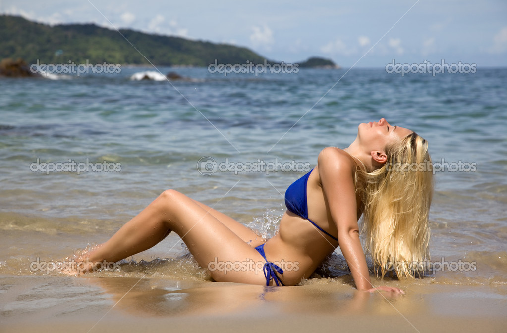 The blonde with long flowing hair on the beach taking a sunbath. Thailand. Phuket