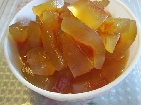 Şurup içinde pişen karpuz kabukları şeffaf bir durum alır. Arzu eden içine gıda boyası veya kızamık şekeri denen şerbet boyasından koyabilir.