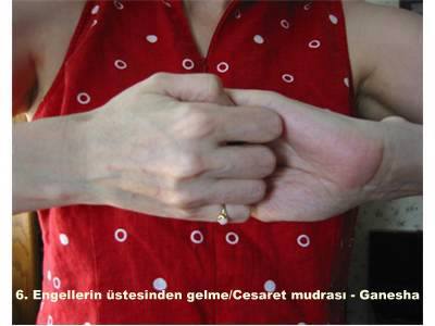 6. Engellerin üstesinden gelme/Cesaret mudrası (Ganesha): Bir mücadele durumunda, zorluklarla yüzleşme gücünü sembolize eder, gerginliğin üstesinden gelerek cesaret kazanmayı sağlar. Eller gergin bir şekilde birbirlerini çekiyormuş gibi gergin tutarlar. Eller, kalp hizasında birkaç kez hızla gerilip de bırakılabilir.