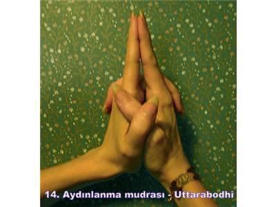 14. Aydınlanma mudrası (Uttarabodhi): İlahi bir güçle ilişkilendirilir ve mükemmel oluşu sembolize eder. İşaret parmağının, her zaman İlahi olanla birliği sembolize ettiği görülmüştür.