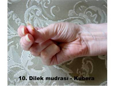 10. Dilek mudrası: (Kubera): Dilek mudrası bir konudaki isteğimize erişmek ve erinç hali için kullanılır. Dileğimizi seslendirirken, avuç içimize parmaklarımızla bastırabiliriz.