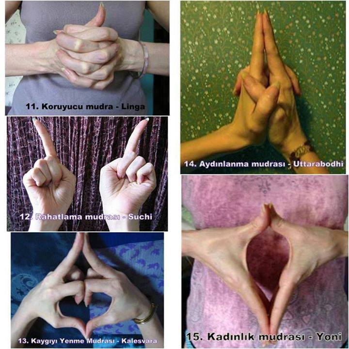 15. Kadınlık mudrası (Yoni): Dişi enerjiyle teması ve rahimi sembolize eder. Bu mudranın sadece kadınlar için olduğunu düşünmemek lazımdır. Tabiat ve toprakla ilgli ve her türlü yaratıcılık ve sezgi gerektiren eylemin, geniş anlamda evrendeki dişi enerjiyle teması gerektirdiği düşünülür.