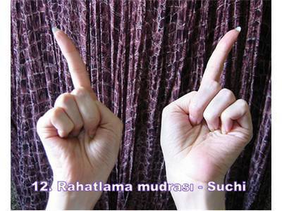 12. Rahatlama mudrası (Suchi): Sabırsızlık, öfke krizleri, başkalarına bağımlılık gibi, kontrol altına alınamayan davranışların uysallaştırılmasında kullanılır.