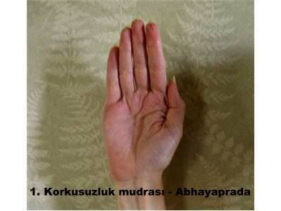 1. Korkusuzluk mudrası (Abhayaprada): Güçlü ve korkusuz olmayı sembolize eder. Ellerin avuçları oldukça düz ve parmaklar bitişiktir, elin ayası bedenin dışına doğru dönüktür. Birçok savaşçı heykelinde ya da resminde görüldüğü üzere, elin bu duruşunun karşı tarafa “dur” manasına da geldiğini düşünebiliriz. Beden diliyle uğraşan birçok uzman, doğruyu söyleyen insanların el ayalarının genelde düz ve karşısındakine doğru açık olduğunu fark etmiş olduklarından, dürüstlüğü de sembolize ettiği düşünülebilir. Zaten kanımca, dürüstlük, korkusuzluğun bir sonucudur.