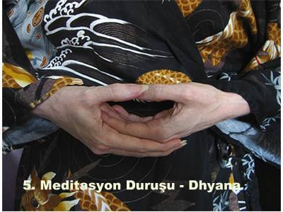 5. Meditasyon Duruşu (Dhyana): Bu duruş evrensel olarak, meditasyon ve rahatlama durumlarında kullanılır. Bedenin, sonradan konsantrasyon gerektiren bir işe hazırlanması öncesinde (misal bir dövüş sanatı ya da sportif bir aktivite öncesi), içsel sessizlik yaratması amacıyla da sıklıkla kullanılır.