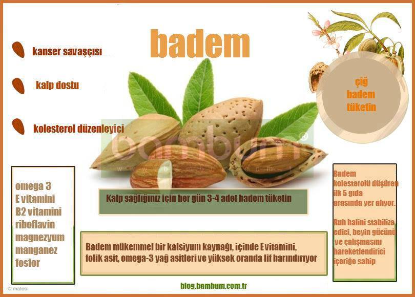 Badem arter duvarlarını güçlendirici ve kan pıhtısı gelişme riskini azaltan L_arginin maddesi zengini bir gıda. Ayrıca kalp ritimlerini düzenleyici omega-3 yağ asitlerini de içeriyor.