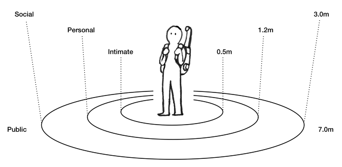 15-35 cm: Gizli konular, tabular, mahremiyet olarak nitelenen özel durumların paylaşıldığı alan. Bu bölgeye az sayıda arkadaş, sevgili ve eş kabul edilmektedir. Kişilerin temas alanıdır; iki sevgilinin, ebeveyn ve çocukların birbirlerine sarılmaları, öpmelerinin doğal karşılandığı alan.