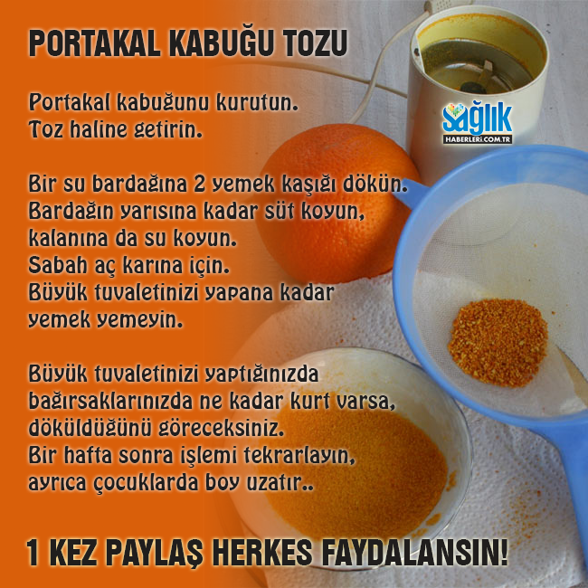 Portakal kabuğunu tüketmeniz için organik portakalları öneriyoruz. Önce kabukları iyice yıkayın ve beyaz kısmını kesip iyice temizleyin. 1 gün kadar kurumaya bırakın. Sonra olabildiği kadar ince doğrayıp, kurutmaya devam edin (2 gün). Daha sonra portakal kabuklarını kurutun. (Hemen küçük doğramaya çalışırsanız çok sıvı kaybediyor. İlk kurutmayı uzatırsanız küçük parçalara ayırmak zor oluyor). Toz haline getirip, eleyin.