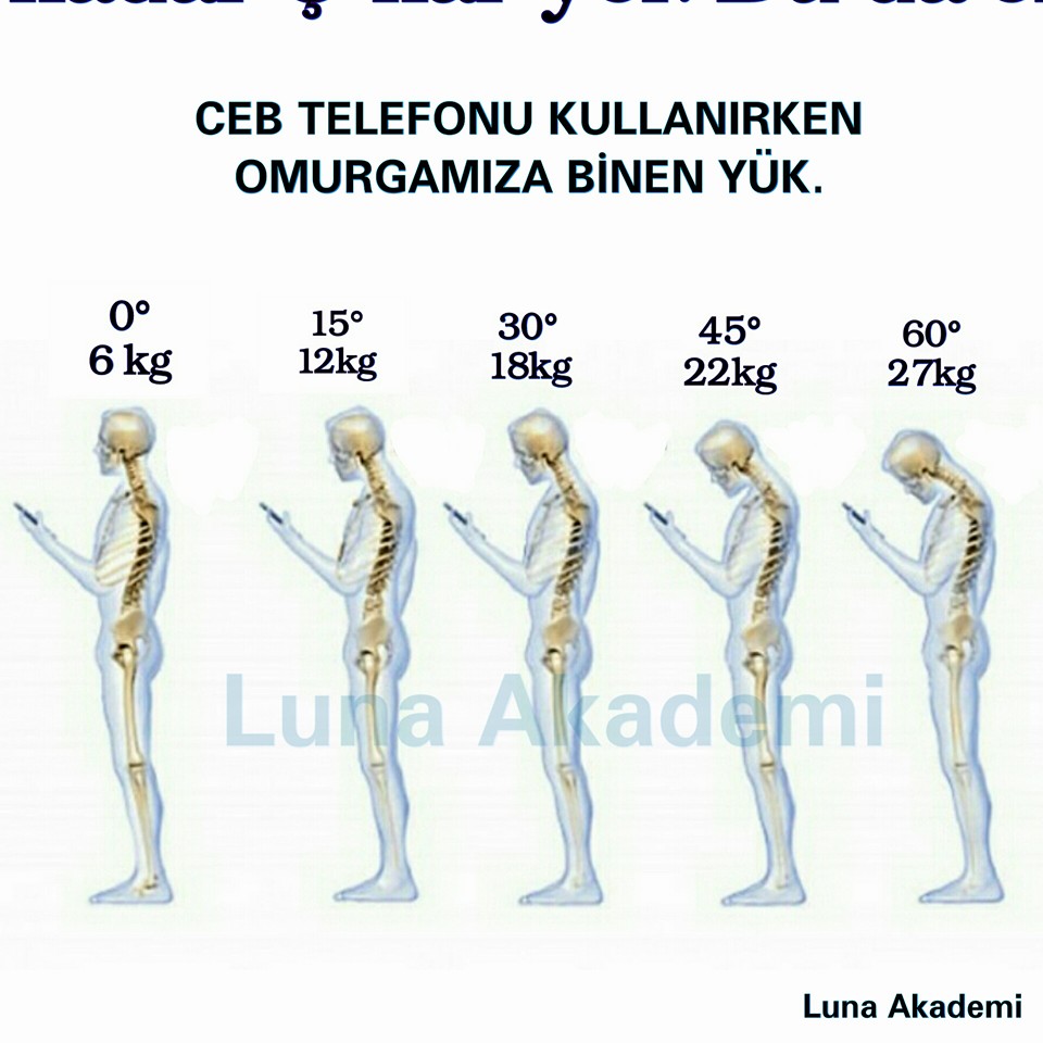 Araştırmalara göre normal duruşumuzda boynunuzla omurganız arasındaki baskı 4.5 kg ile 5.5 kg arasında değişiyor. Fakat akıllı telefon kullanırken oluşan 60 derecelik açı bu baskıyı 27 kilograma kadar çıkarıyor. Bu da omurganın zarar görmesine neden oluyor.