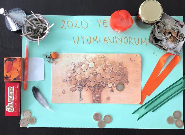 Dilekleri yazdığımız kağıtları katlayıp kavanozun içine atıyorsunuz, kuş tüyünü, ıhlamuru, şekeri, çörek otunu, kullanılmamış ada çayını, turuncu taşı (ya da sevdiğiniz bir taşı), altı adet bir lirayı ve 500 kuruşluk madeni paraları kavanozun içine atıyorsunuz. Yeşil ve turuncu iple ya da fiyonkla kavanozu bağlarken ” 2020 enerjilerine uyumlanıyorum, hizalanıyorum bir ve bütün oluyorum. 2020 dileklerimin olmasını seçiyorum, seçiyorum, seçiyorum” diyorsunuz ve ertesi gün size uyan bir zamana kadar ritüel alanına dokunmuyorsunuz.