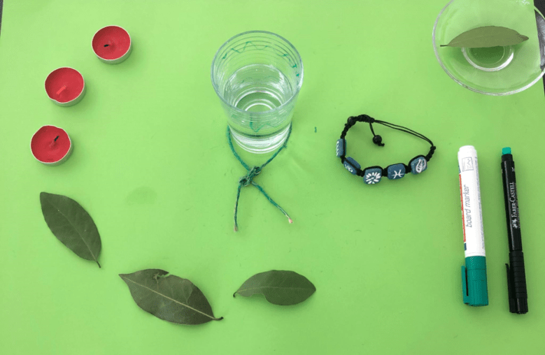 Madde 7) Üç adet üzerine dilek yazılmış defne yaprağını ritüel alanındaki suya koyuyorsunuz. Ve en sevdiğiniz takıyı da suya koyuyorsunuz ve ‘’ dileklerim bana koşuyor, dileklerim bana koşuyor, dileklerim bana koşuyor’’ diyorsunuz.