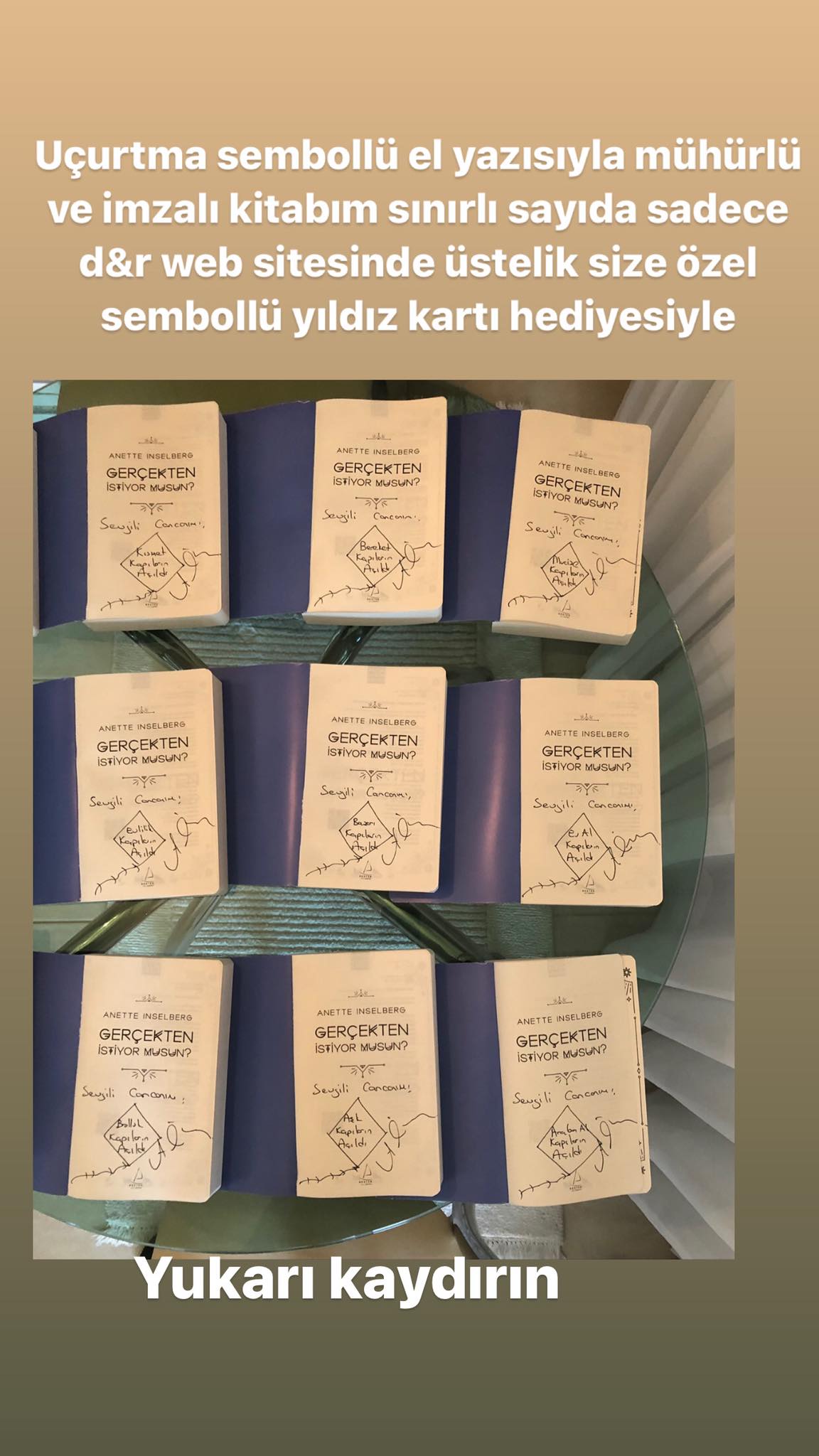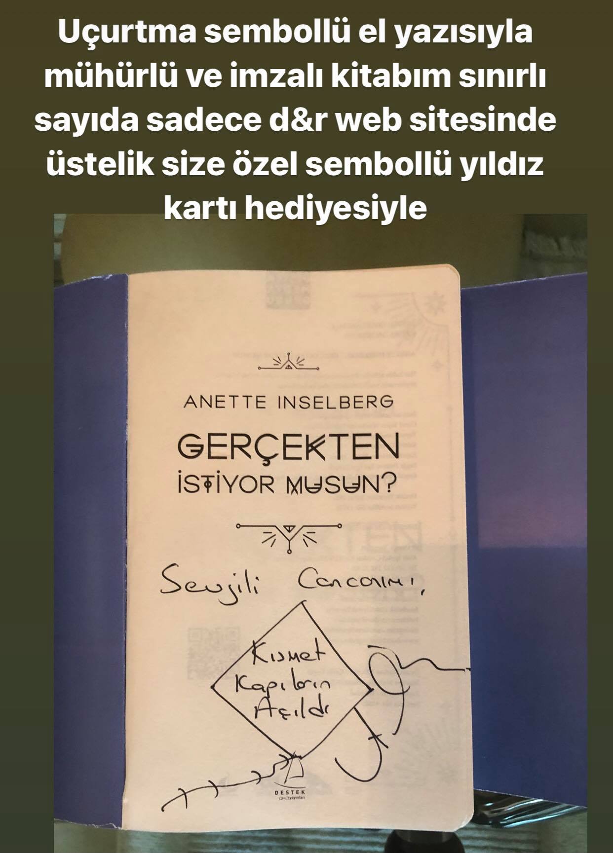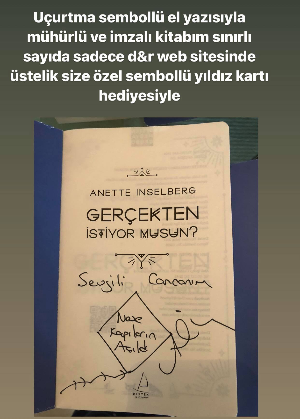 Uçurtma sembollü el yazısıyla mühürlü (bolluk,aşk,evlilik, şans, araba al, ev al , başarı, mutluluk, mucize, kısmet toplamda 15 adet çeşidiyle ) ve imzalı kitabım sınırlı sayıda sadece d&r web sitesinde yüzde 37 indirim fırsatıyla ve üstelik size özel sembollü yıldız kartı hediyesiyle![]()